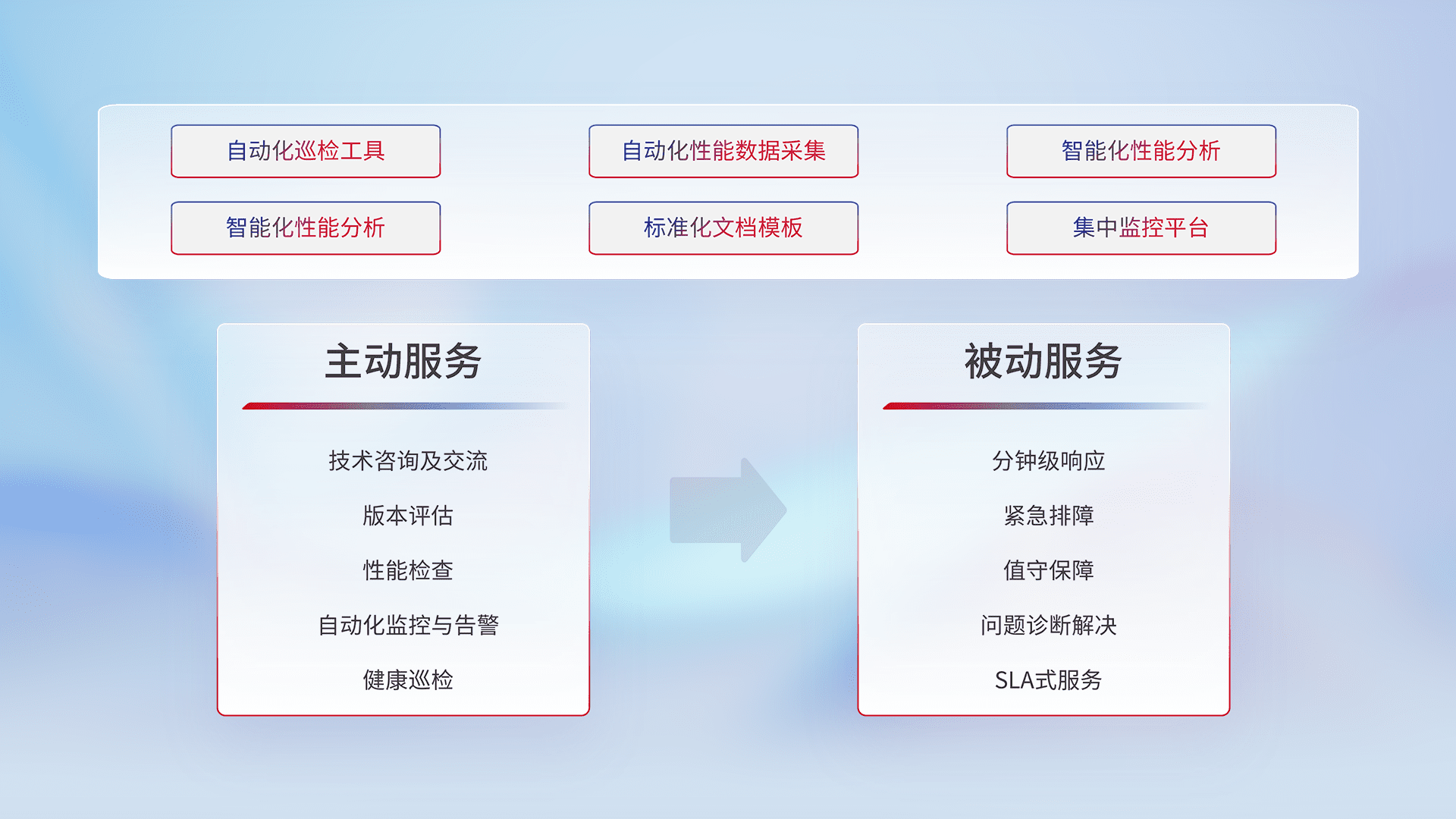 智能化工具和标准化文档,,保障服务质量,,,,提供主动服务(包含技术咨询、、、版本评估、、、性能检查、、、、自动化监控与告警、、、、健康巡检)和被动服务包含(分钟级响应、、、、紧急排障、、、、值守保障、、问题诊断解决、、SLA服务)。。。